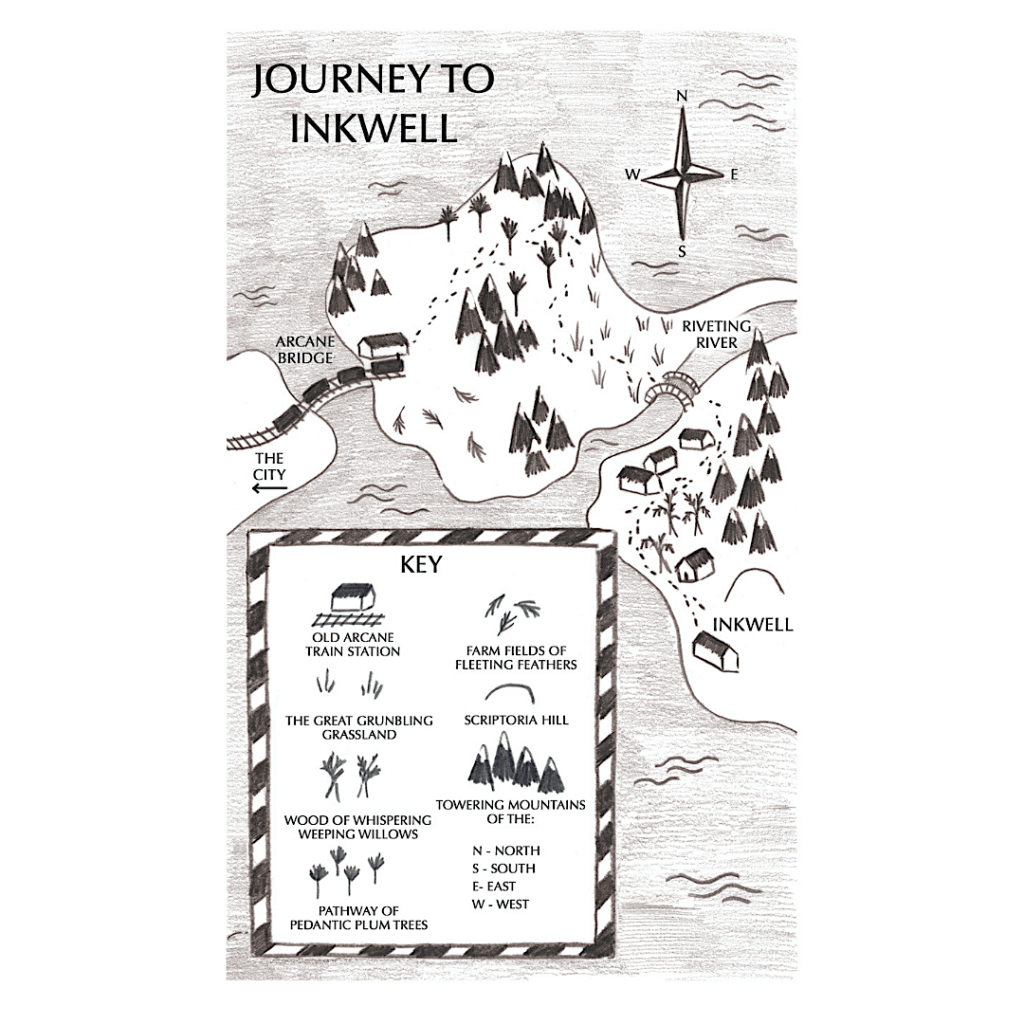 It’s a long journey to Inkwell! To get there, Florence must travel through the Farm Fields of Fleeting Feathers, the Pathway of Pedantic Plum Trees, the Great Grumbling Grassland, the Riveting River Valley and the Wood of Whispering Weeping Willows.