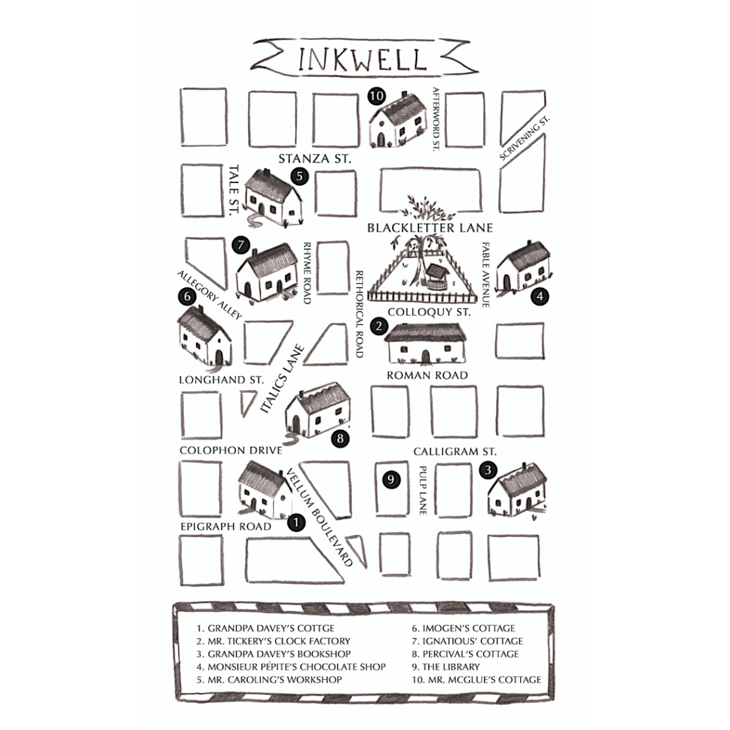 “It was a quiet morning in Inkwell. Florence, Ben and Grandpa Davey left the cottage and walked down Vellum Boulevard. Then they took Italics Lane, a peculiar street where all the houses were tilted just a few inches to the right, making the passers-by feel askew.” Chapter Ten, The Word-Keeper